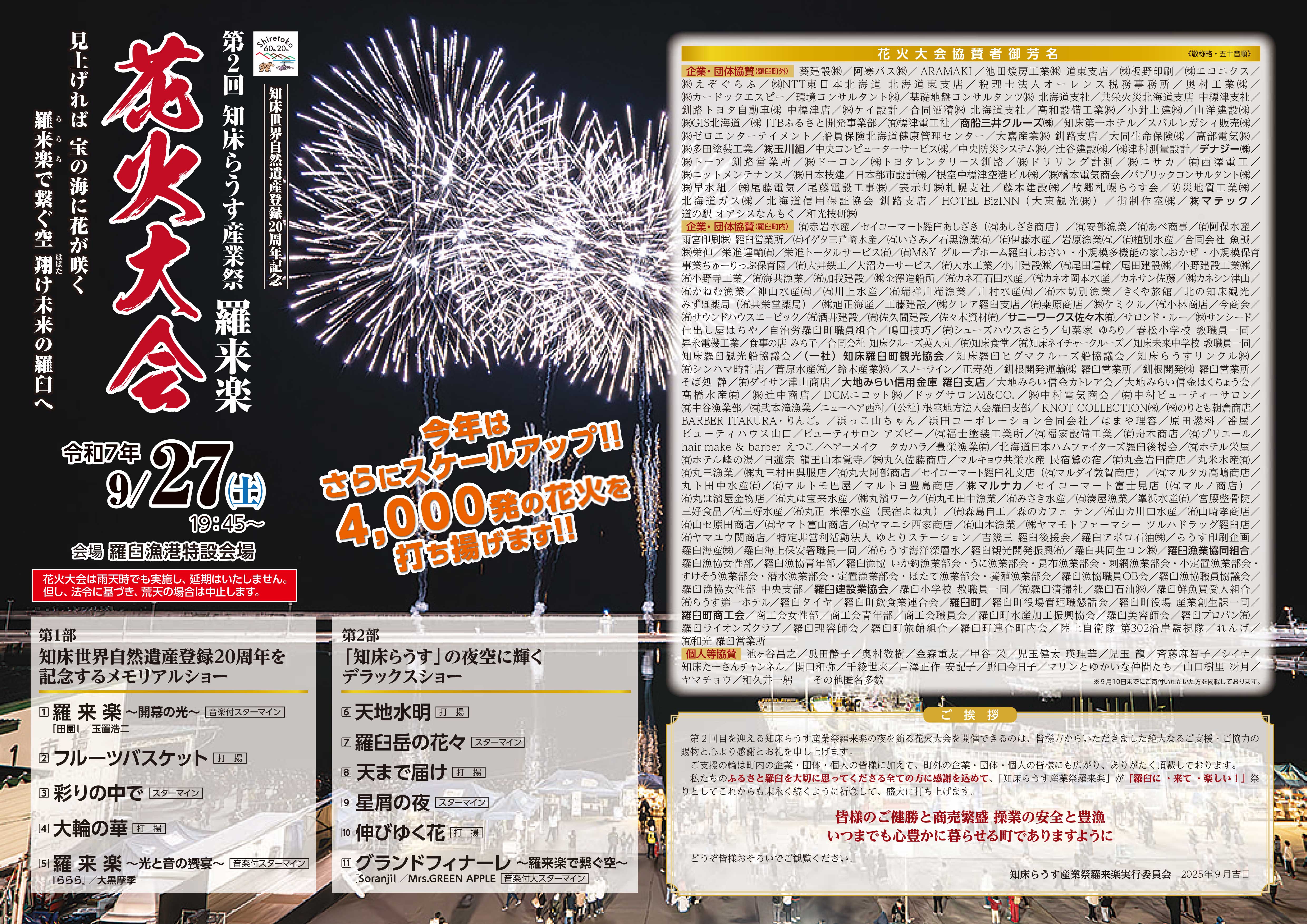令和6年度からスタートした羅臼町の新たなイベント「知床らうす産業祭羅来楽(ららら)」は、町内の各団体等が一体となって作り上げる、伝統と新しい魅力が融合した一大イベントです。町民や観光客が集い、笑顔や歓声に包まれる会場には、地元ならではの味覚や賑わいが広がり、訪れる人々に忘れられないひとときを届けます。祭りを通して、羅臼の魅力を存分に体感できる特別な時間をお楽しみいただけます。